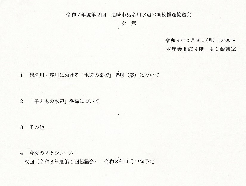 9日。尼崎市役所で、尼崎市猪名川水辺の楽校推進協議会・第2回協議会が開催されました。猪名川・藻川に子ども達を中心に川と触れ合い水遊びや自然遊びができる場所を造ることも目指して協議が進められています。河川管理者の国土交通省近畿地方整備局猪名川河川事務所を中心に尼崎市・尼崎市教育委員会・地域の市民団体が構成員になっています。地域の市民団体として、自然と文化の森協会が委員として参加しています。
