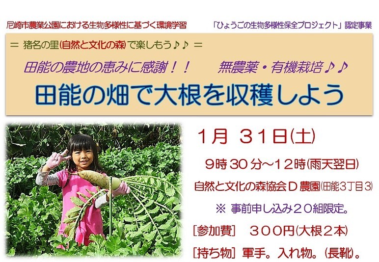 31日。自然と文化の森協会のD農園で大根の収穫体験イベントを実施しました。2回目の大根収穫です。朝から雪が降り続く寒い日でしたが、20組の募集がほぼ埋まり、ご家族連れで参加いただいた40人のみなさんに収穫を楽しんでいただきました。