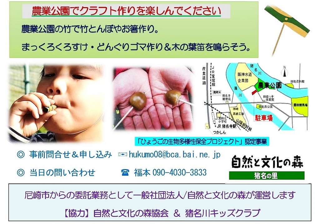 農業公園には、真竹(まだけ)と孟宗竹(もうそうちく)の竹林があります。竹かご作りなどの竹細工に使用されるのは、主に真竹です。農業公園の真竹を使って、竹トンボや竹の箸作りにチャレンジします。また、農業公園の木の実を使ってのミニクラフト作りや木の葉を使っての木の葉笛作りもおこないます。