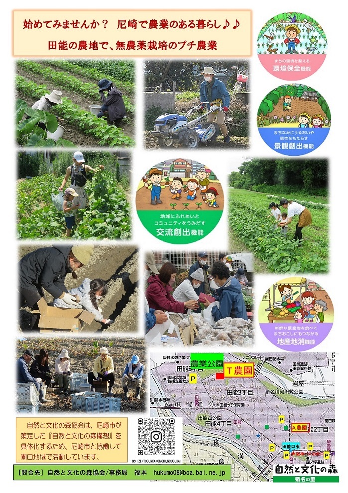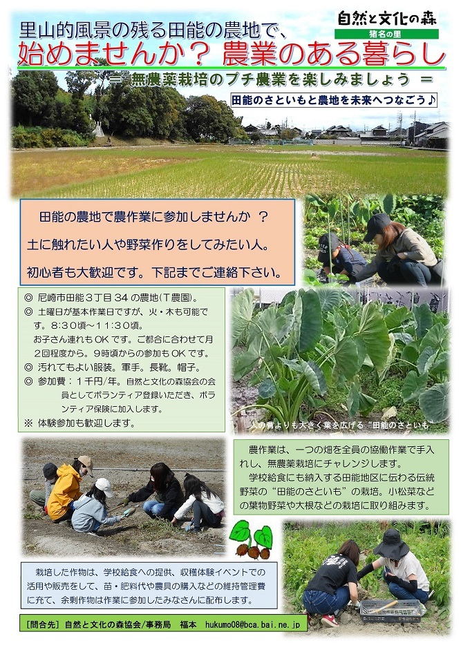 自然と文化の森協会では、農業公園横の農地をお借りして、伝統野菜:田能のさといもなどの栽培をおこなっています。田能の農地で農作業に参加しませんか ? 土に触れたい人や野菜作りをしてみたい人。初心者も大歓迎です。