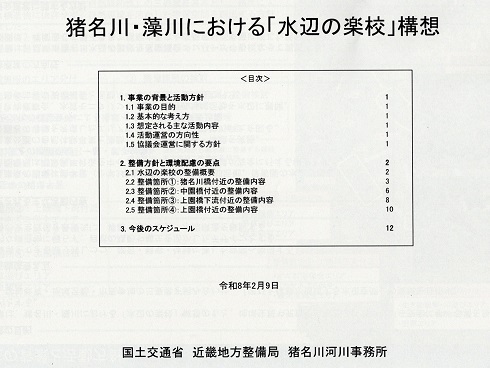 猪名川河川事務所長の開会あいさつの後、2025年度の活動報告がおこなわれ、参加者からの意見交換がおこなわれました。夏におこなわれた猪名川水環境交流会は、ステージでの活動発表も多くあり、各ブ−スの体験コ−ナ−と合わせて好評だったようです。2026年度も、目指す方向性を「川とふれあい、人とふれあう、身近な川へ」とし、「@水遊びができる水質にしよう。A人が集まる水辺のしよう。B猪名川を学ぼう」を基本目標として、水環境交流会・アユの産卵場づくり・ヒメボタル幼虫調査・一斉水質調査などにとりくんでいくことが確認されました。