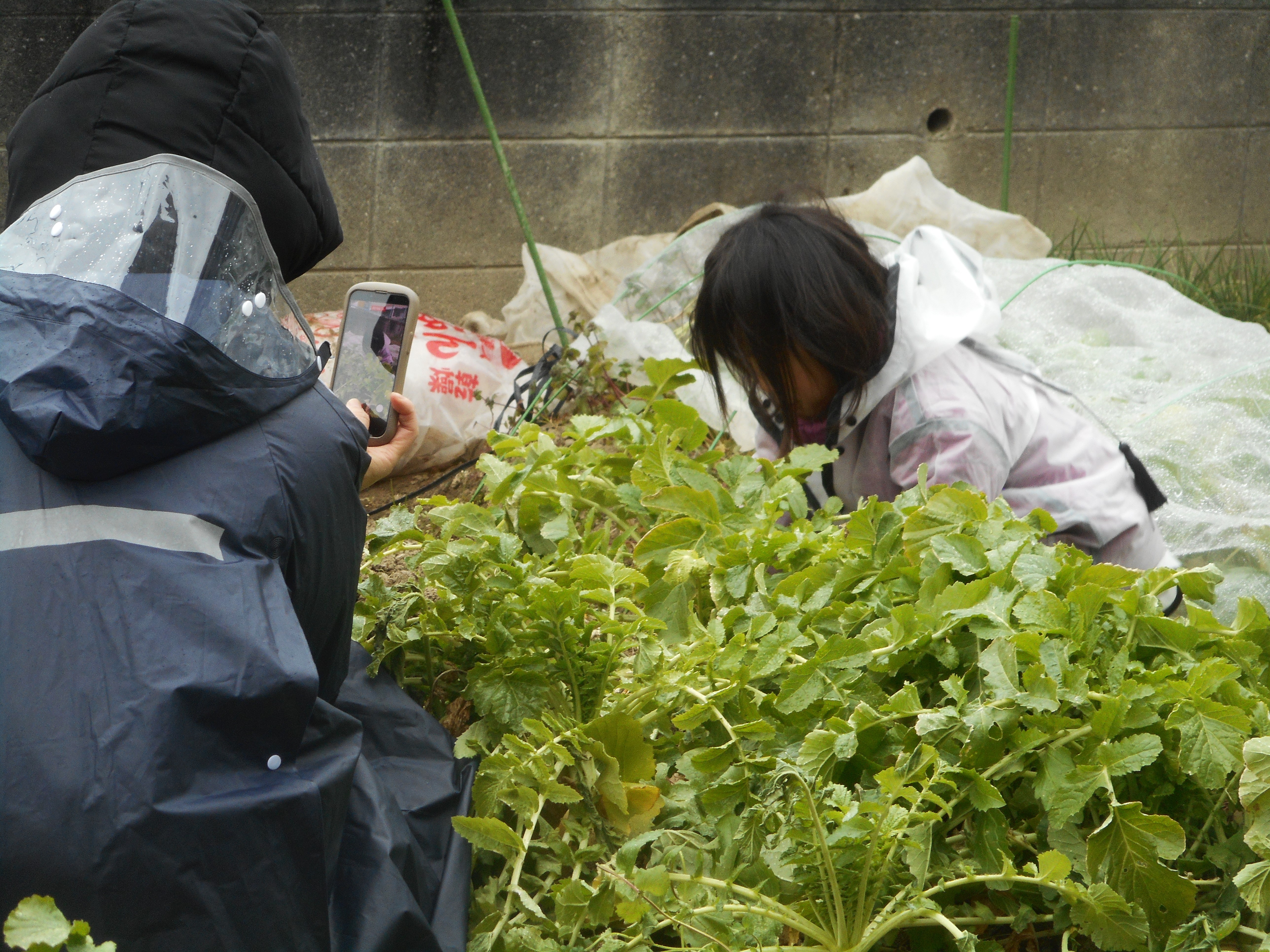 大きく育った大根葉、小さな子ども達の力ではなかなか抜けませんでした。力を入れて何度も引いて、やっと抜けました。大根を収穫した時は、みんなニコニコ顔です。無農薬栽培なので、葉っぱも安全で美味しく食べていただけます。