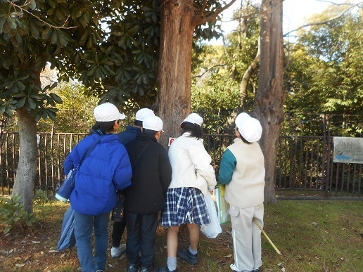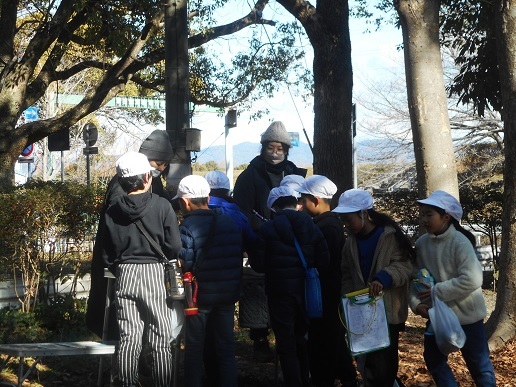 お弁当が入った荷物を置いて、自然観察オリエンテーリングです。探検ボ−ドに公園の地図をつけ、水筒を持ってスタ−トです。公園の中に12ノポイントが設定されており、ポイントを見つけると3択の問題を解いていきます。6番のポイントはメタセコイアの大きな木の高さを考えます。