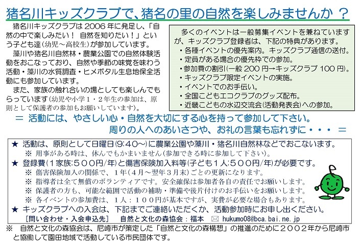 2026年度の猪名川キッズクラブへの登録を受け付けています。猪名川キッズクラブは、傷害保険(ボランティア保険)加入の関係で1年ごとの登録制です。乳幼児から高校生までが対象で尼崎市外居住の方もOKです。体験参加も歓迎します。高校生・大学生・元気な中高年などのボランティアスタッフも歓迎します。詳しくは、下記までご連絡ください。
