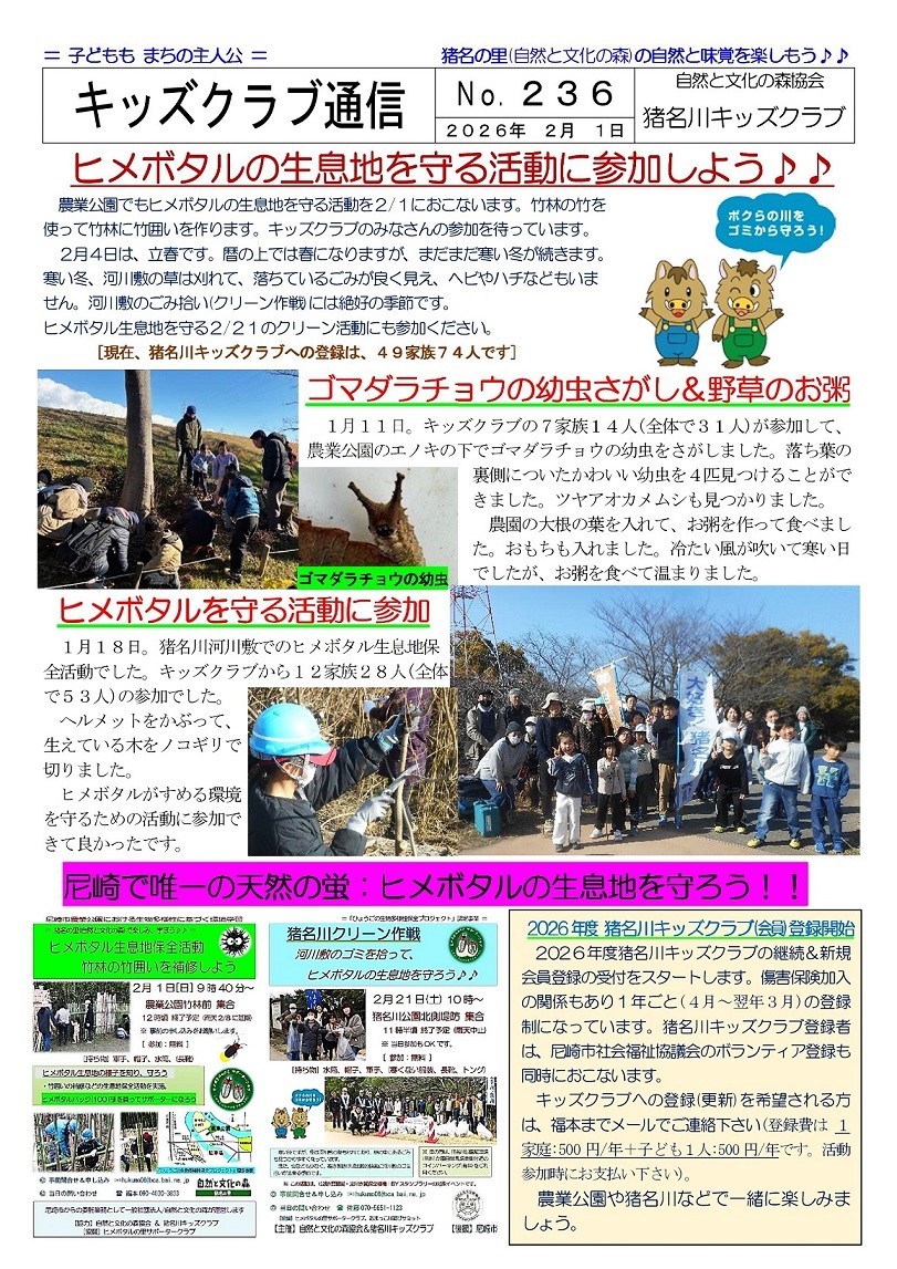 猪名川キッズクラブ通信No.236(2026年2月)ヒメボタルの生息地を守る活動に参加しよう