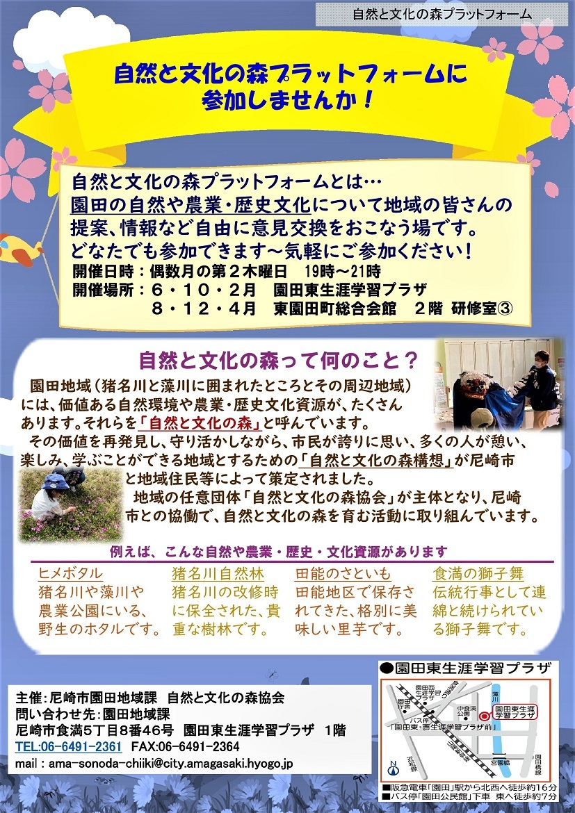 「自然と文化の森プラットフォーム」は、園田の自然や農業・歴史文化について地域の皆さんの提案・情報など自由に意見交換をおこなう場です。尼崎市園田地域課と自然と文化の森協会が主催し、偶数月の第2木曜日に定期的に開催しています。12月11日(木)は東園田フリ−スペース(東園田町4丁目)での開催です。どなたでも参加いただけます。お気軽にご参加ください!