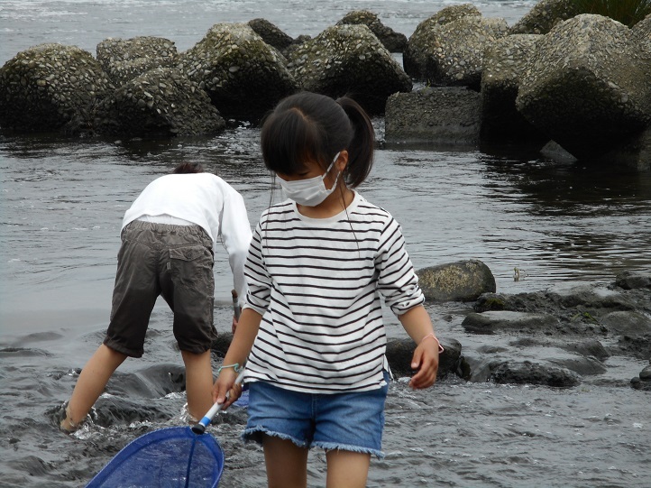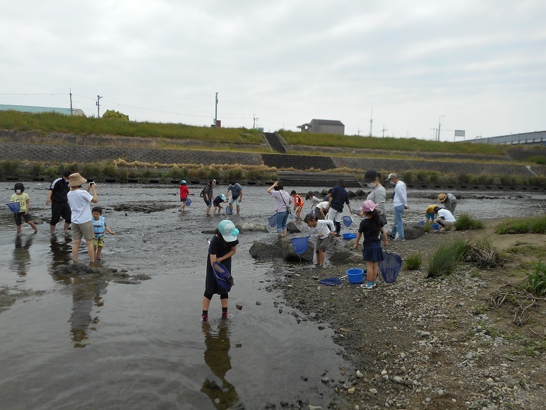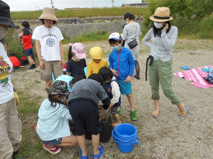 最後に捕まえた生き物の観察をしました。ウキゴリの子ども、テナガエビ、コオニヤンマのヤゴ、アメンボなどが捕まりました。河川敷のセイヨウカラシナには、モンシロチョウの卵やかえったばかりの小さな幼虫(青虫)が見つかりました。自然と親しみ楽しそうな子ども達の姿と同時に、「久しぶりに息抜きが出来てほっとしています」と言われる親御さんの姿も印象的でした。