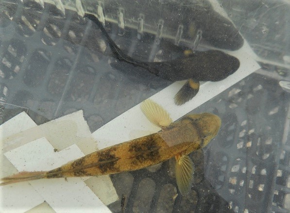 利倉橋と新南園橋の間にある堰の下流側での実施です。石の下をさぐると、チチブが何匹も見つかりました。模様がきれいなゴクラクハゼも捕まりました。モクズガニもたくさんいて、子ども達は大喜びです。「藻川の水のほうがきれい!!」と言いながらも、楽しそうです。