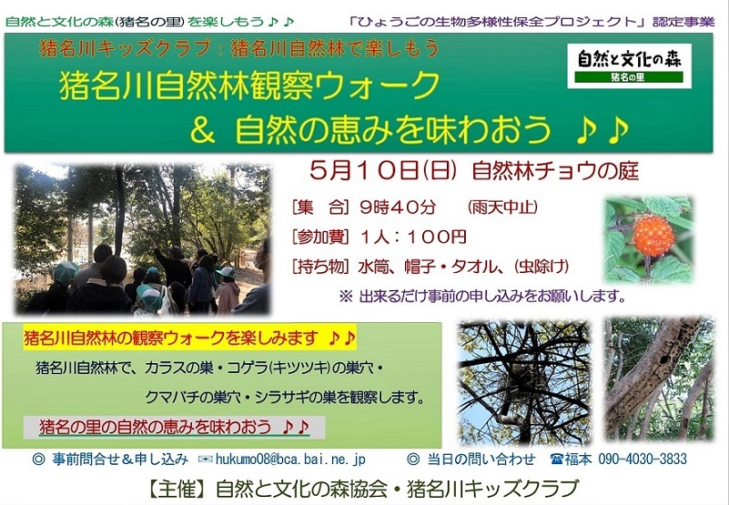 キッズクラブ2020:猪名川自然林観察ウォーク&自然の恵みを味わおう(5/10)ご案内