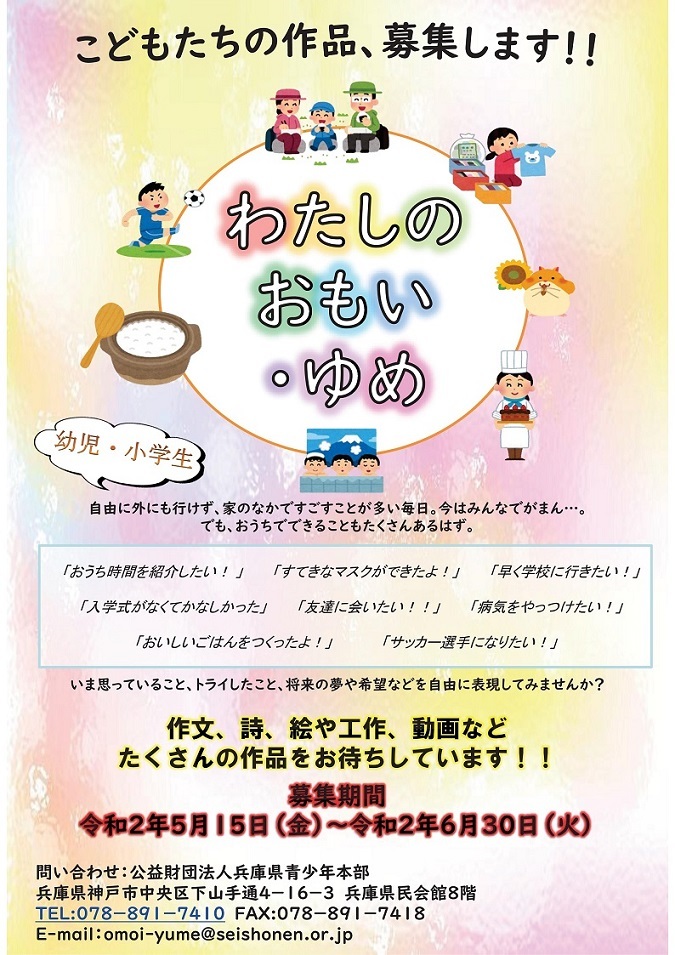 「わたしのおもい・ゆめ」子ども達の作品募集(6/30締切)のお知らせ [兵庫県青少年本部]