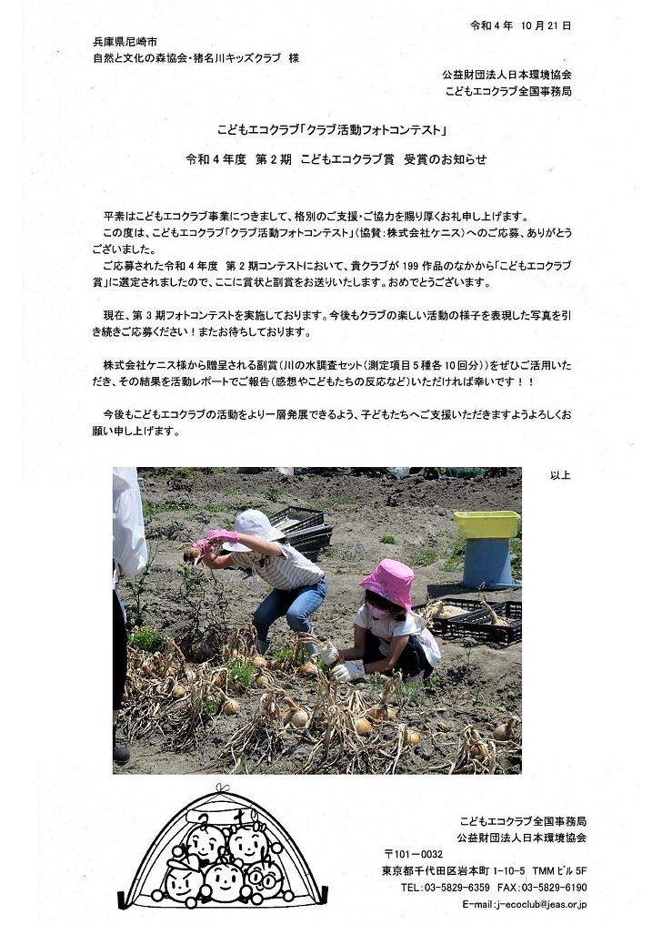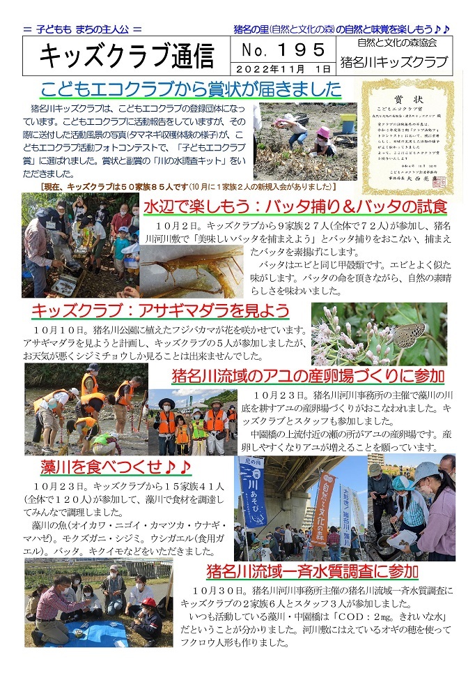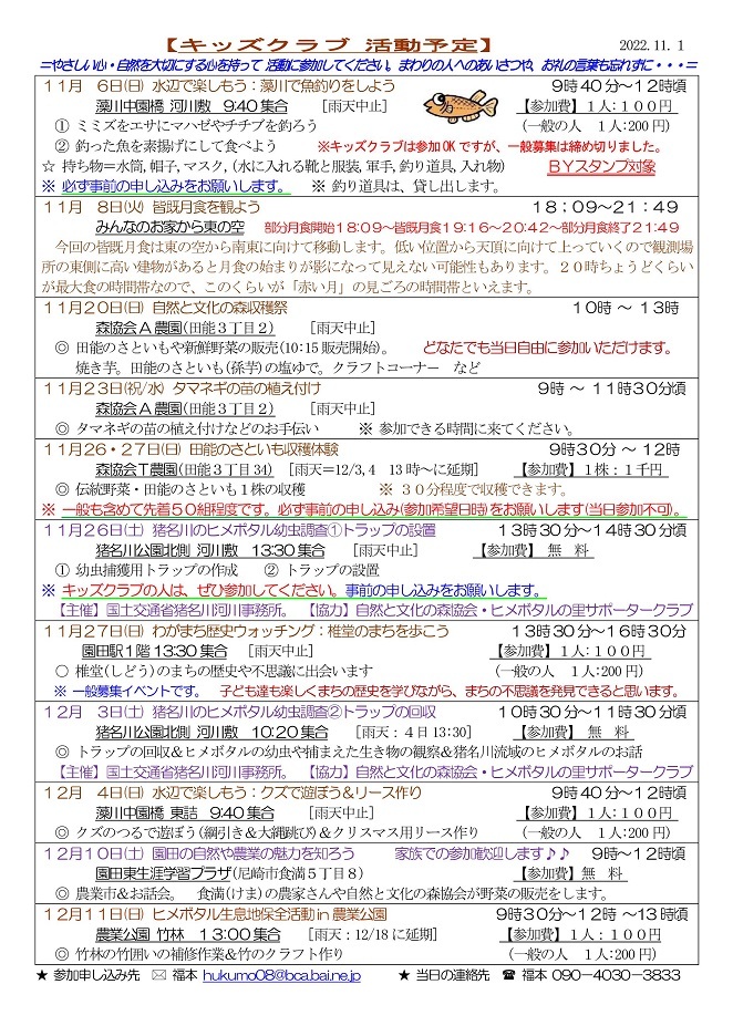 イベントによっては一般参加者の募集もおこなっていますが、新型コロナウィルス感染症対策のため、猪名川キッズクラブ会員以外の方の参加は、事前の申し込みをお願いしています。猪名川キッズクラブは2006年に発足し、「自然の中で楽しみたい! 自然を知りたい!」という子ども達が入会(登録)し活動に参加しています。10月末現在で、50家族85人の子ども達(幼児〜高校生)が登録して活動に参加しています。家族の触れ合いの場や親御さんの交流の場としても楽しんでもらっています。新型コロナ感染症対策もあり、2022年度の猪名川自然林での活動は一般募集をせずにキッズクラブ会員のみで行う予定にしています。