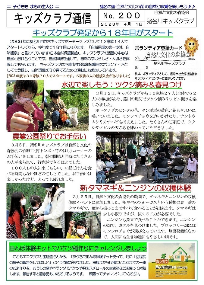 猪名川キッズクラブは、傷害保険加入の関係で1年ごとの登録制です。現在、2023年度会員の募集をおこなっています。幼児から高校生までが対象で尼崎市外居住の方もOKです。体験参加も歓迎します。高校生・大学生・元気な中高年などのボランティアスタッフも大歓迎です。詳しくは、下記までご連絡ください。