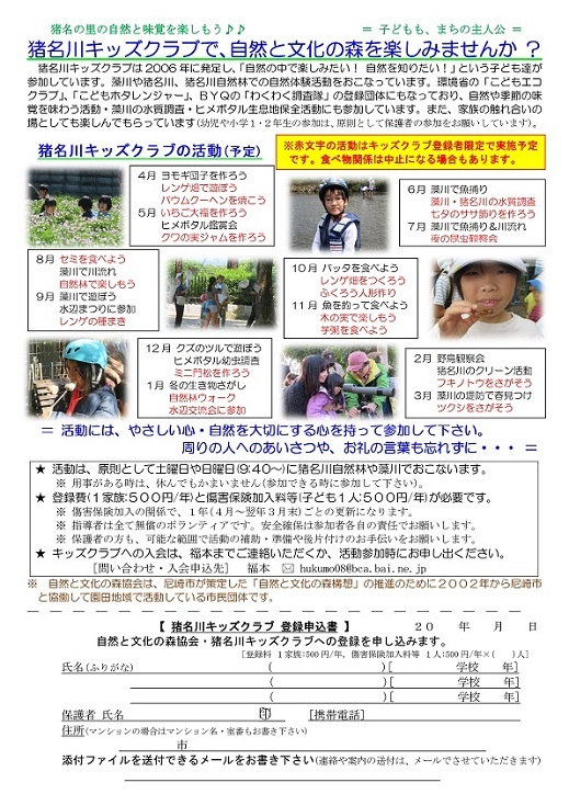 猪名川キッズクラブは、傷害保険加入の関係で1年ごとの登録制です。幼児から高校生までが対象で尼崎市外居住の方もOKです。体験参加も歓迎します。高校生・大学生・元気な中高年などのボランティアスタッフも歓迎します。詳しくは、下記までご連絡ください。