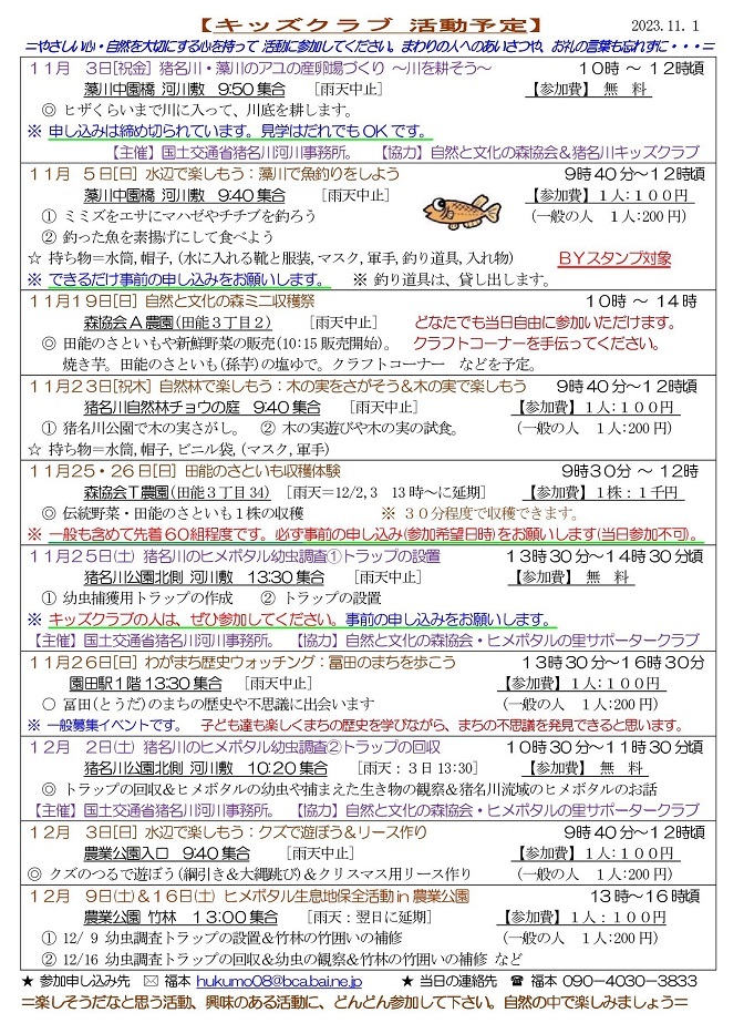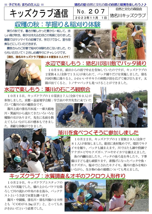 猪名川キッズクラブは2006年に発足し、「自然の中で楽しみたい! 自然を知りたい!」という子ども達が入会(登録)し活動に参加しています。2023年度は10月末現在で48家族83人の子ども達(幼児〜高校生)が登録して活動に参加し、家族の触れ合いの場や親御さんの交流の場としても楽しんでいます。イベントによっては一般参加者の募集もおこなっていますが、猪名川キッズクラブ会員以外の方の参加は、事前の申し込みをお願いしています。