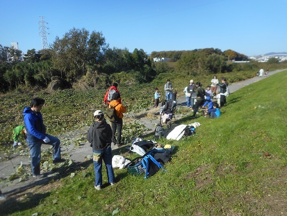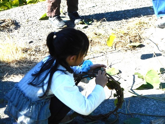 田能の春日神社の前を通って、藻川の上園橋北側まで移動します。河川敷に生えるクズのツルを使って楽しみます。河川敷に生えるクズのツルを引っ張り出して、ツルを確保します。最初はクリスマスに向けてリ−ス作りです。長いツルを輪っかにして何回か巻き、その周りを細いツルで巻いていきます。素敵なリ−スが出来ていきます。