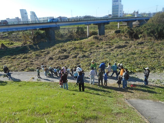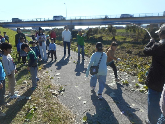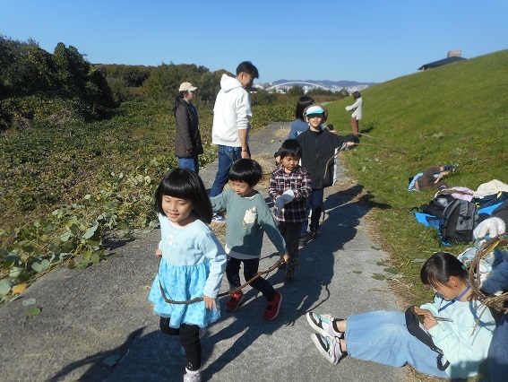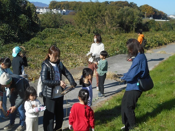小さな子ども達は電車ごっこです。みんなで仲良く走り回っていました。河川敷に生えるクズのツルが素敵なリ−スや遊び道具に大変身です。オンブバッタや口の赤いクビキリギス、カメムシ、大きなミミズも見つけました。藻川の河川敷で楽しい時間を過ごすことができました。