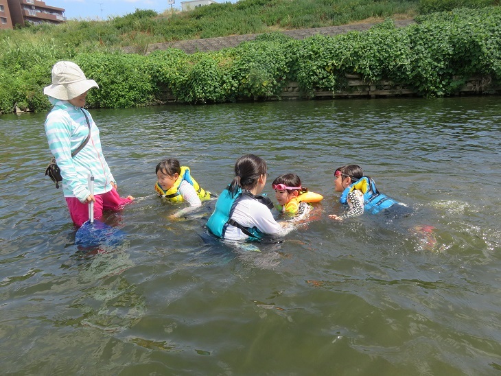 藻川にひざくらいまで入って、たも網を手にして魚や生き物さがし。希望者にはライフジャケットを着けて川流れも楽しんでいただきます。一般参加の方は必ず事前の申しこみをお願いします。琵琶湖・淀川水質保全機構(BYQ)の「BYスタンプラリー」の対象となる活動です。