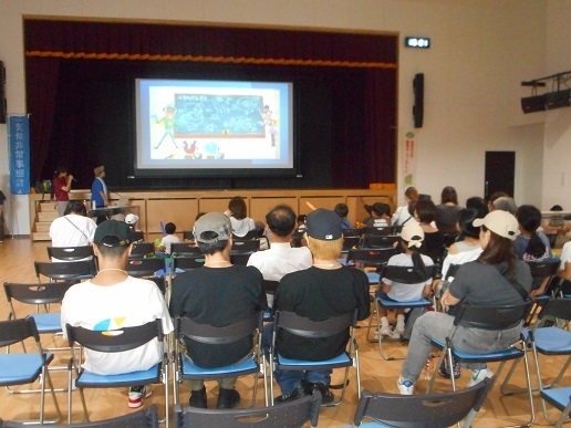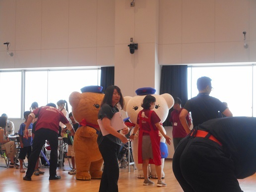地球温暖化を考えるブースもあります。温暖化を考えるパワーポイントが上映され、参加者で地球温暖化について考えました。最後に、プラザの外で、プラザで雨水タンクに蓄えられた雨水を手作りのひしゃくで撒いて、打ち水体験です。打ち水の後は、気温が下がっているのを体感しました。
