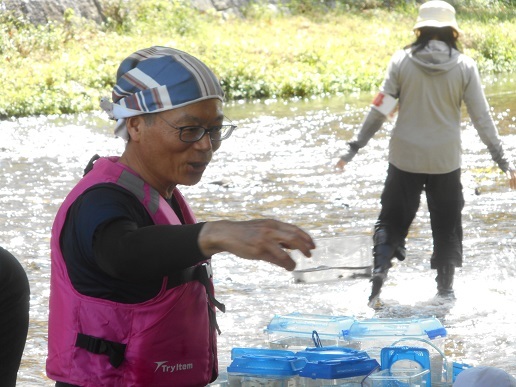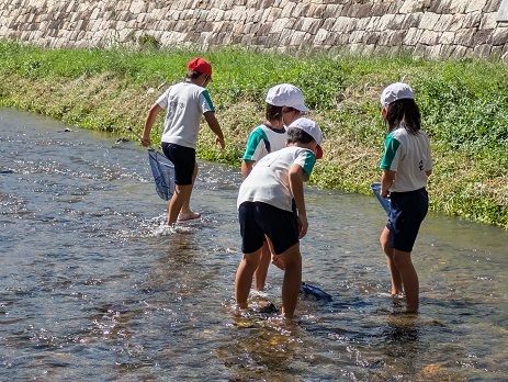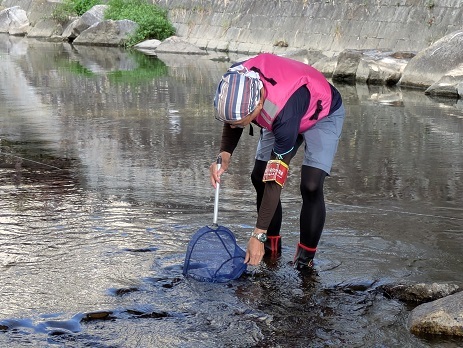 スタッフが魚や生き物のさがし方を示した後は、庄下川に入って生き物さがしです。水は少し冷たかったのですが、スタッフに言われたように石を動かすと、すぐにヨシノボリがアミに入りました。かわいいヨシノボリが次々とアミに入ります。ドンコも見つかりました。