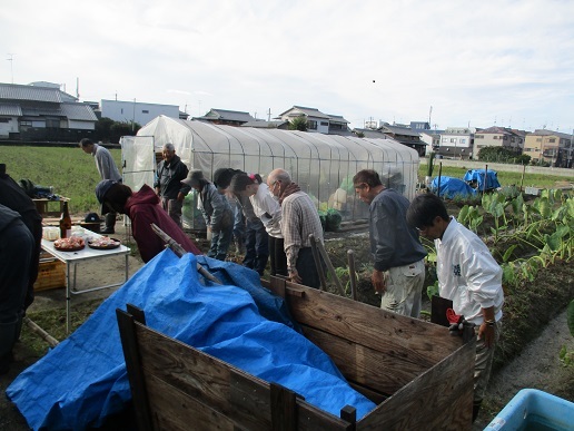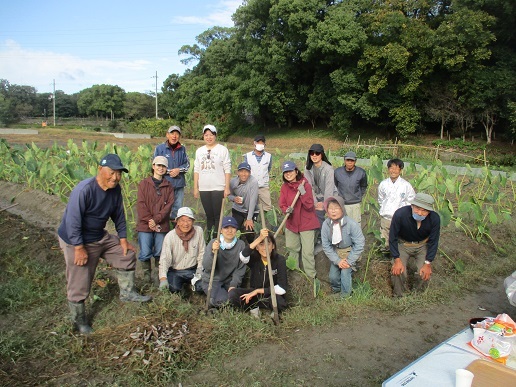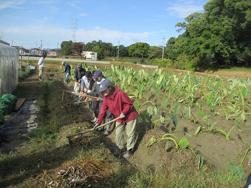 1日。朝 清々しい秋晴れのもとT農園に農業部会のみなさんが集まり、4月に種芋を植え付けた田能のさといもが収穫期を迎えたことを祝い、鍬入れ神事をおこないました。