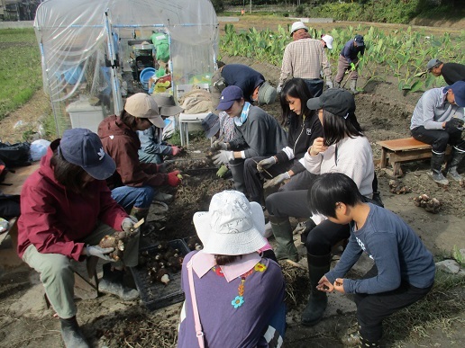 鍬入れ神事の後全員で収穫祭に向けて田能のさといもの掘り出し、髭取り作業を行いました。