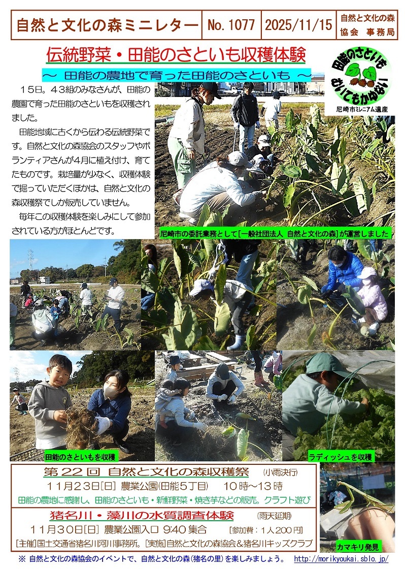 自然と文化の森ミニレターNo.1077(11/15)伝統野菜:田能のさといも収穫体験