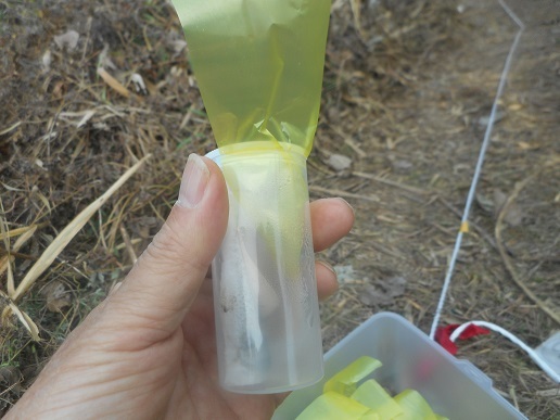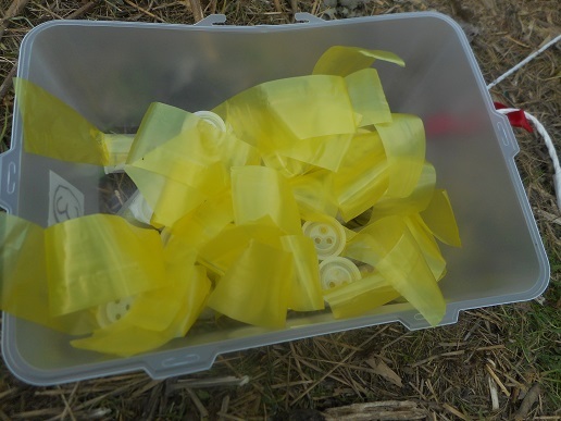 フィルムケースにタニシを入れてトラップ作りからスタ−トです。キッズクラブの子ども達が頑張って、30個トラップを作りました。