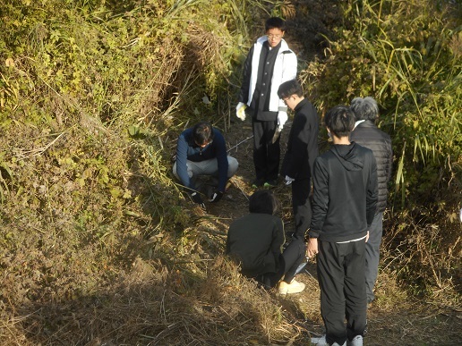 トラップを河川敷に埋めていきます。目印のロ−プに印に沿って埋めていきます。ヒメボタルの小さな幼虫が入りやすいように、丁寧に埋めていきます。豊中市の刀根山高校の高校生も参加して一緒にトラップの設置をしました。キッズクラブで60個のトラップを設置しました。