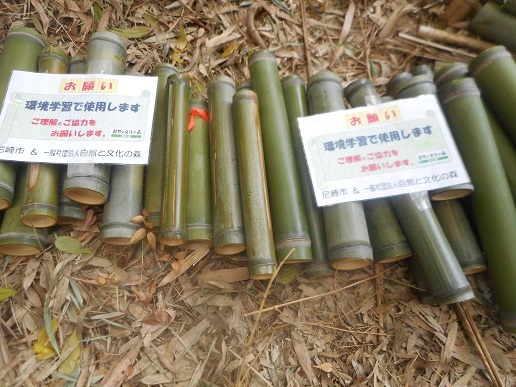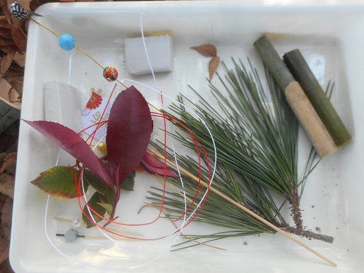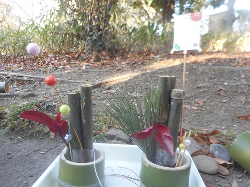 農業公園の竹を使ってミニ門松作りにチャレンジです。ノコギリを使って竹を切ります。太い竹を頑張って切りました。細い竹も切って、太い竹にマツの緑の葉やカナメモチの赤い葉、お正月飾りなどを入れていきます。素敵なミニ門松の完成です。