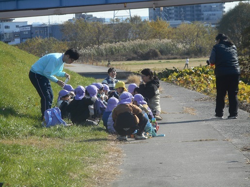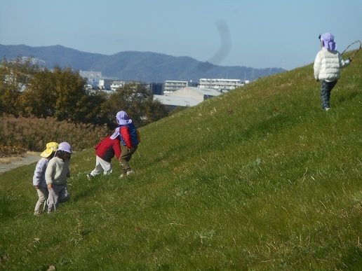 風もなくポカポカと下陽射しの中で、藻川の河川敷で昼食です。昼食の後は、堤防で自然遊びを楽しみます。ヨモギやノビルの匂いを嗅いで自然を感じます。クズのツルを使ってリ−スを作ったり、大繩跳びや電車ごっこをして堤防を走り回っています。自然の中で一日楽しんでもらえました。