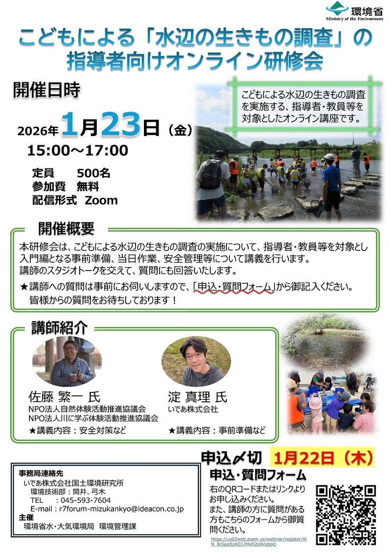 こどもによる「水辺の生き物調査」の指導者向けオンライン研修会(1/23)ご案内 [環境省]