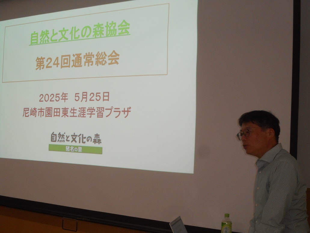 25日。会員55名の過半数を超える参加で、2025年度の通常総会を園田東生涯学習プラザで開催しました。冒頭に、松本眞尼崎市長から届いた「農業公園を農業体験や環境体験・自然体験が出来る場として再整備を進める。猪名川で水辺の楽校構想を実現させるべく国土交通省と協議している。自然と文化の森協会も共に進んで欲しい」というビデオレターを紹介しました。