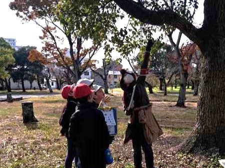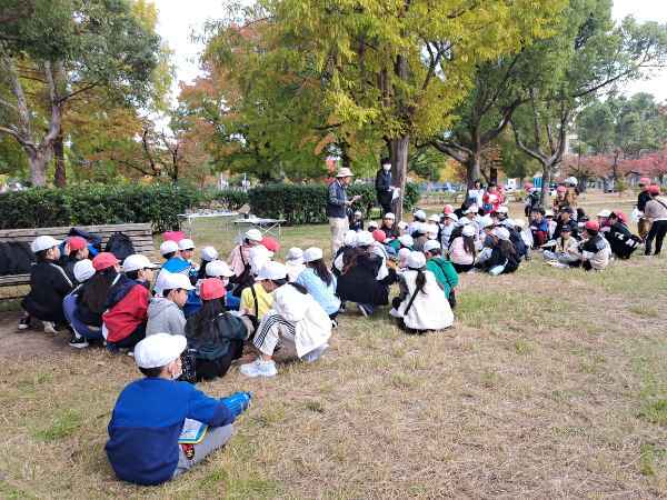 14日。西武庫公園の東(武庫の里1丁目)にある尼崎市立武庫の里小学校3年生73人が、学校から歩いて西武庫公園までやって来ました。自然と文化の森協会から6人がスタッフとして参加し、西武庫公園での環境体験学習をコーディネートし子ども達の活動を支援しました。