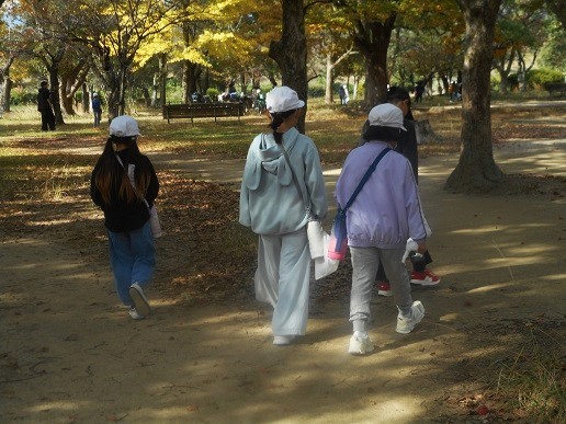 6日。藻川の西側・食満1丁目にある尼崎市立園田小学校3年生129人が、学校から歩いて猪名川風致公園までやって来ました。子ども達とは2年生の時のサツマイモ掘り体験と合わせると4回目の出会いです。自然と文化の森協会から11人がスタッフとして参加し、猪名川自然林での環境体験学習を支援しました。