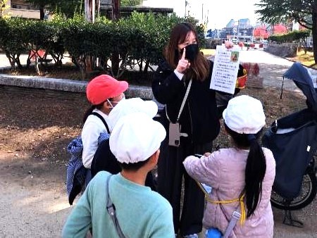 給食までに学校にもどるという予定でした。少し急いで回ってもらったので疲れたようでした。朝は気温が下がり氷も張っていたのですが、活動中は陽射しも暖かく快適に行動出来ました。無事に活動を終え、給食に間に合うように学校に戻れそうです。