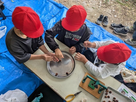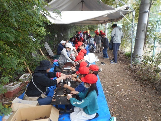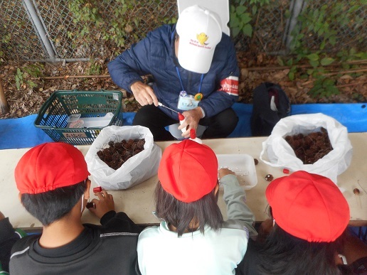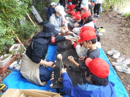 大きなアベマキのどんぐりで、ドングリゴマを作ります。「木の実穴あけ機」という名のどんぐりに穴を空けるドリルを使います。よく回るコマの完成で、友達と一緒に回します。マテバシイのどんぐりは、あく抜きをしないでも食べられる美味しいドングリです。湯がいたものを食べてもらいました。「クリの味!」です。身近な自然のものを使っていろいろと楽しんでもらうことが出来ました。人数が多かったのでスタッフは疲れ気味でしたが、子ども達からの「ありがとうございました。楽しかったです」という言葉で疲れも和らぎました。