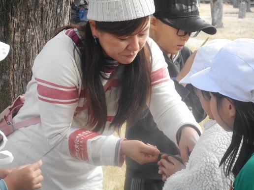 途中のポイントではスタッフがいて、自然尾解説や自然を楽しむコ−ナ−があります。マツの木の横では、松葉相撲をします。テントウムシについてのお話も聞きました。