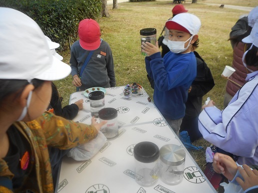ゴールでは、スタッフから草笛の鳴らし方を教えてもらいました。しばらく練習すると素敵な音が出るようになりました。今朝 スタッフが捕まえた生き物も展示されています。赤とんぼ・キチョウ・トノサマバッタも見つかっています。背中の模様が人の顔に見えるオオホシカメムシが人気でした。水路のドンコやヨシノボリ、ザリガニもいます。さがすと自然がいっぱいの西武庫公園でした。