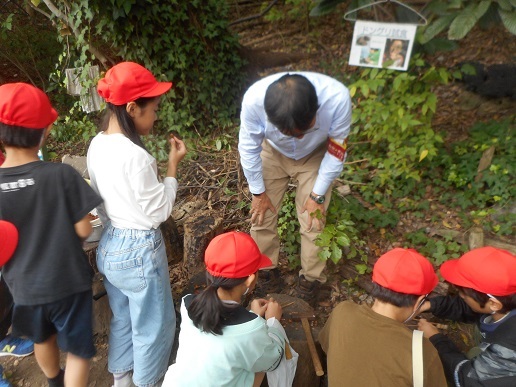 公園の地図と自然観察ビンゴカ−ドを手にして、公園の中を散策しながらビンゴの課題を見つけます。小鳥の羽を見つけました。「動物の落とし物」という課題発見です。木の幹にはたくさんのキノコが生えています。課題の「キノコ」を発見です。寒さが厳しくなってきた公園ですが、さがしていくと色々なものが見つかります。