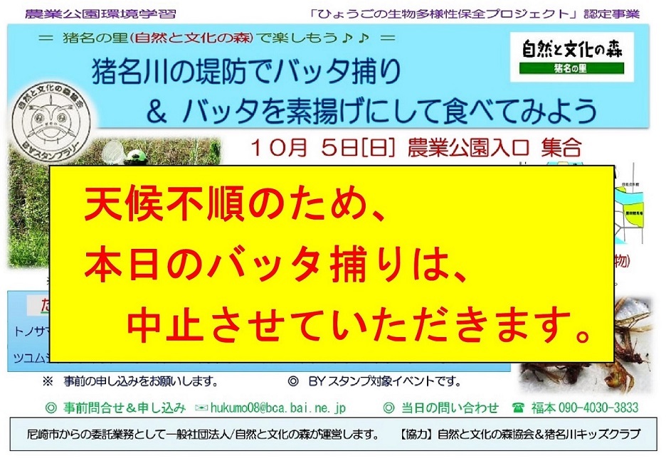 本日(10/5)のバッタ捕り&試食会は中止します