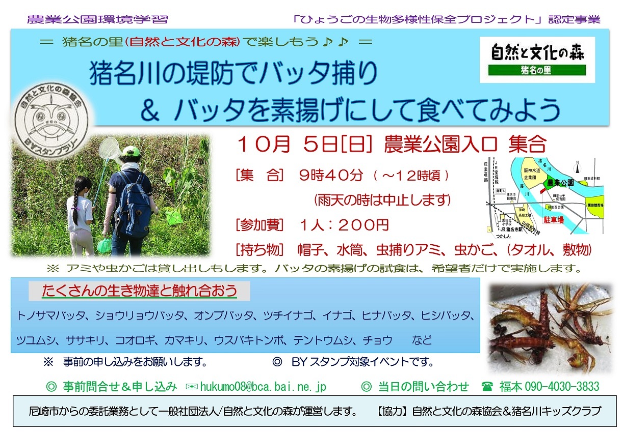どなたでも参加いただけますが、準備のためメールでの事前の申し込みをお願いします。バッタはエビやカニと同じ仲間です。エビやカニもアレルギーがある方は試食はおやめください。この活動は、(公財)琵琶湖・淀川水質保全機構の実施するBYスタンプラリーの対象イベントです。BYスタンプ台紙をお持ちの方は当日押印します。