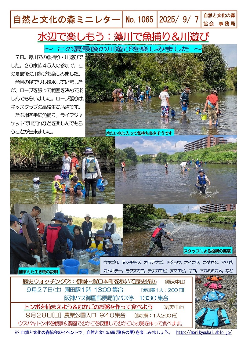 自然と文化の森ミニレターNo.1065(9/7)水辺で楽しもう:藻川で魚捕り&川遊び