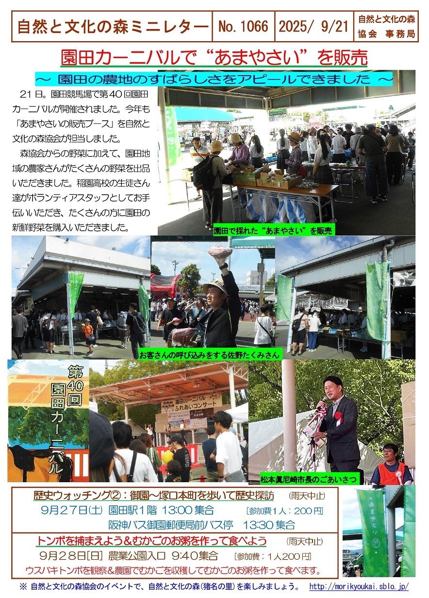 自然と文化の森ミニレターNo.1066(9/21)園田カ−ニバルであまやさいを販売