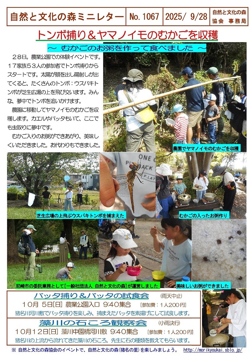 自然と文化の森ミニレターNo.1067(9/28) トンボ捕り&ヤマノイモのむかごを収穫