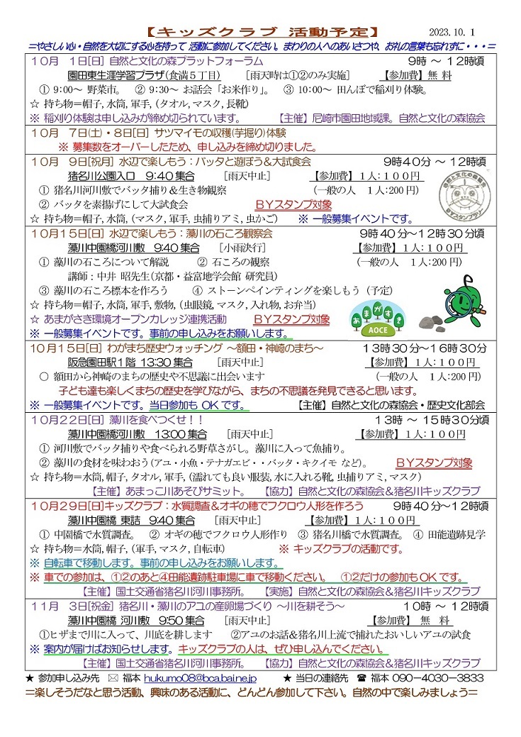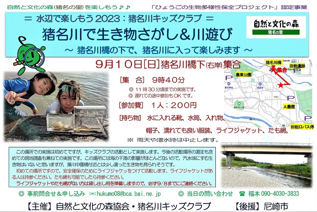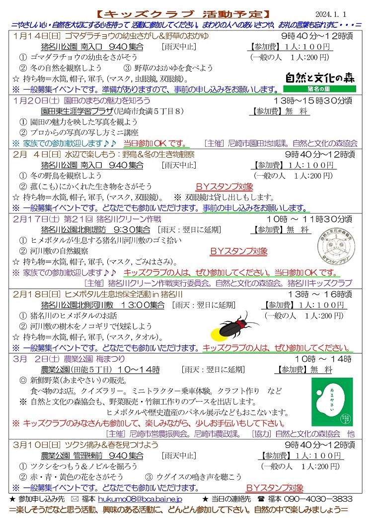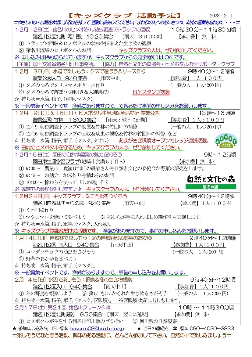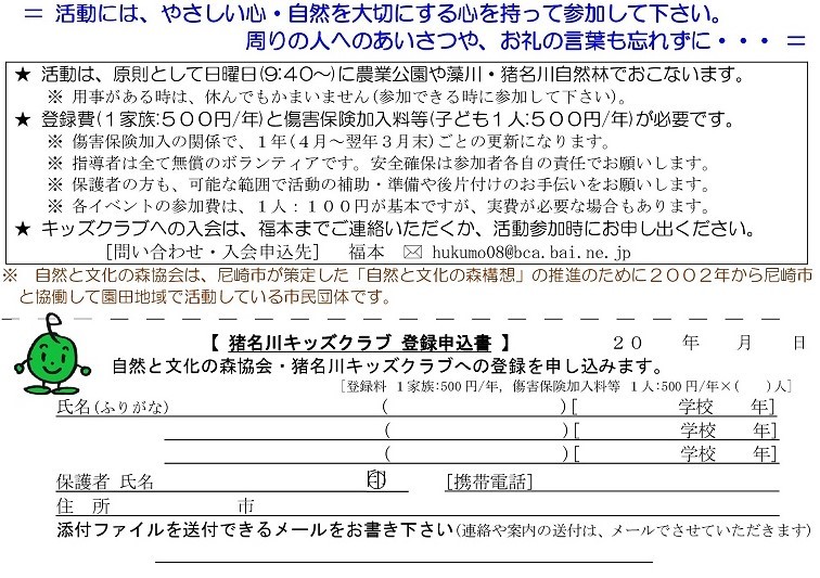 2024年度猪名川キッズクラブの募集を開始します。猪名川キッズクラブは、傷害保険加入の関係で1年ごとの登録制(4月〜3月)です。幼児から高校生までが対象で尼崎市外居住の方もOKです。体験参加も歓迎します。高校生・大学生・元気な中高年などのボランティアスタッフも歓迎します。詳しくは、下記までご連絡ください。