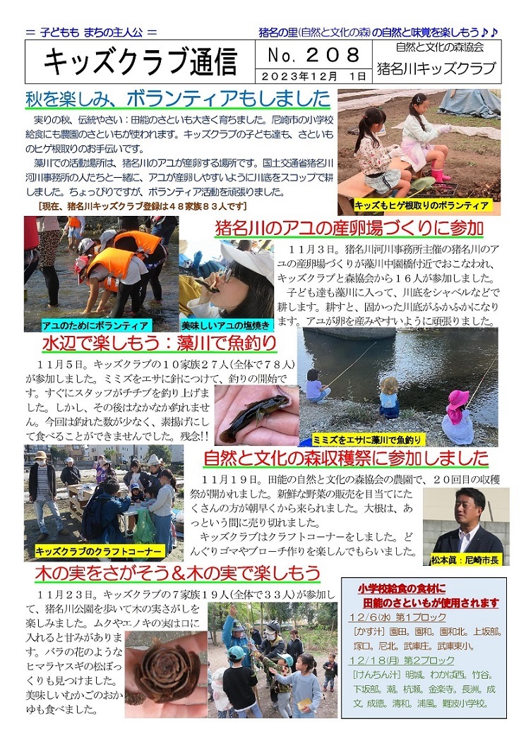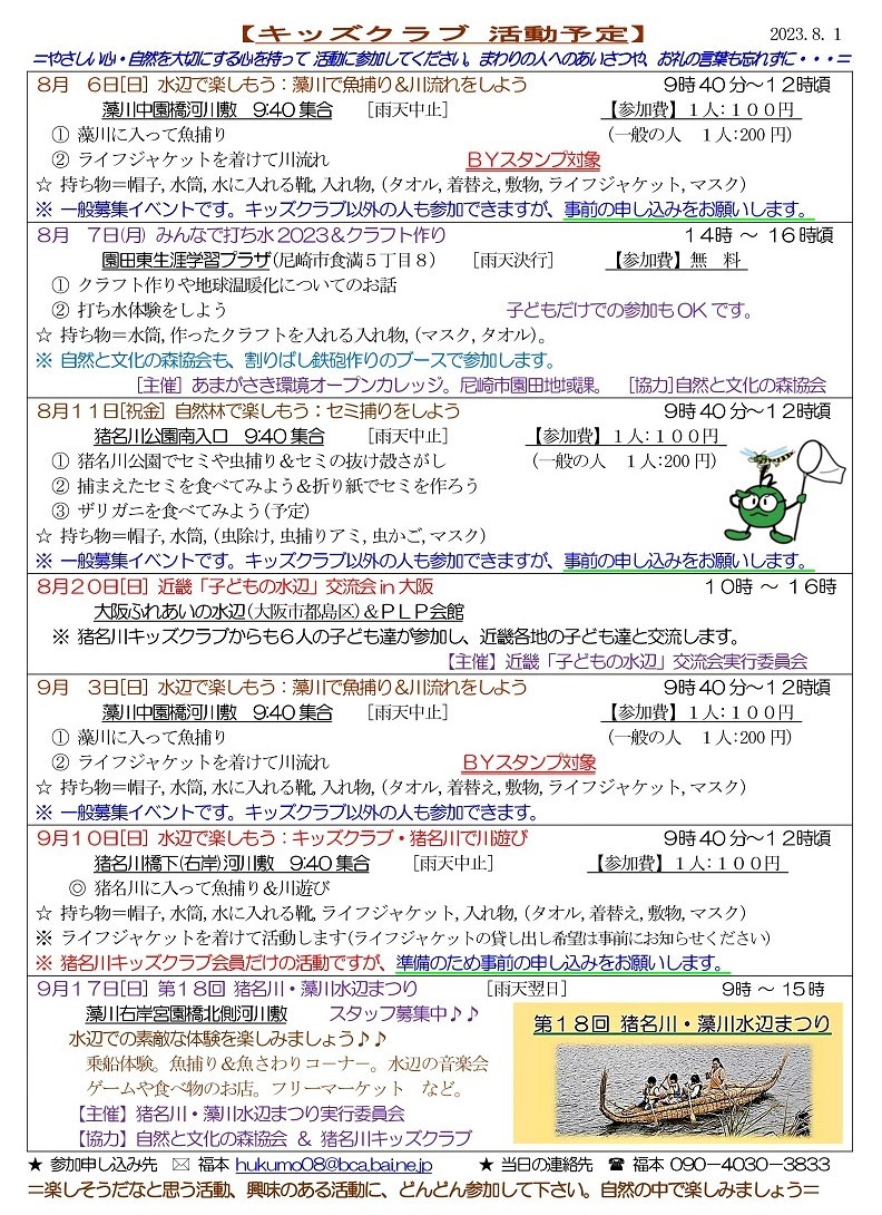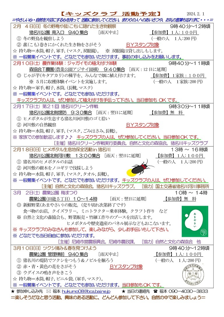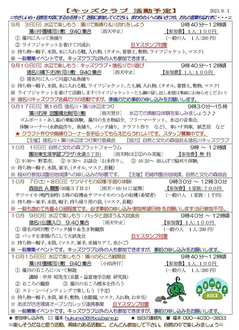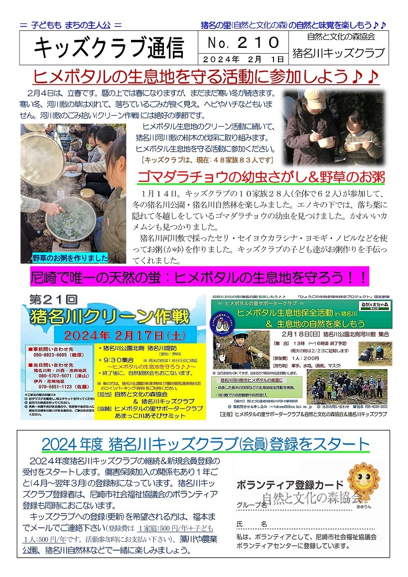 2024年度猪名川キッズクラブの募集を開始します。猪名川キッズクラブは、傷害保険加入の関係で1年ごとの登録制(4月〜3月)です。幼児から高校生までが対象で尼崎市外居住の方もOKです。体験参加も歓迎します。高校生・大学生・元気な中高年などのボランティアスタッフも歓迎します。詳しくは、下記までご連絡ください。