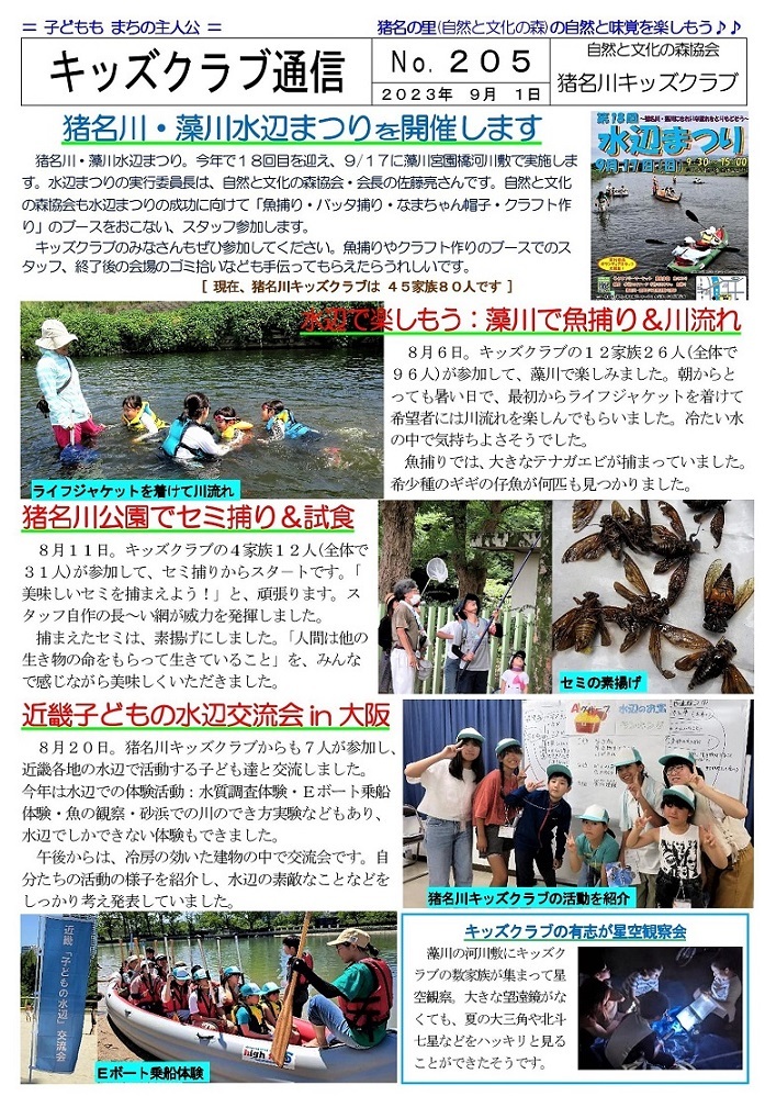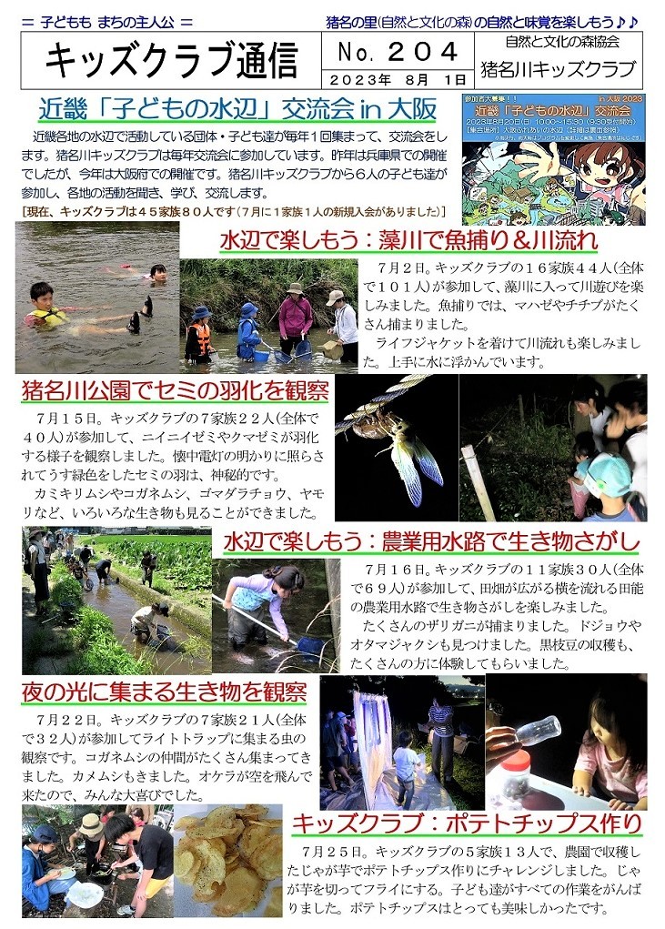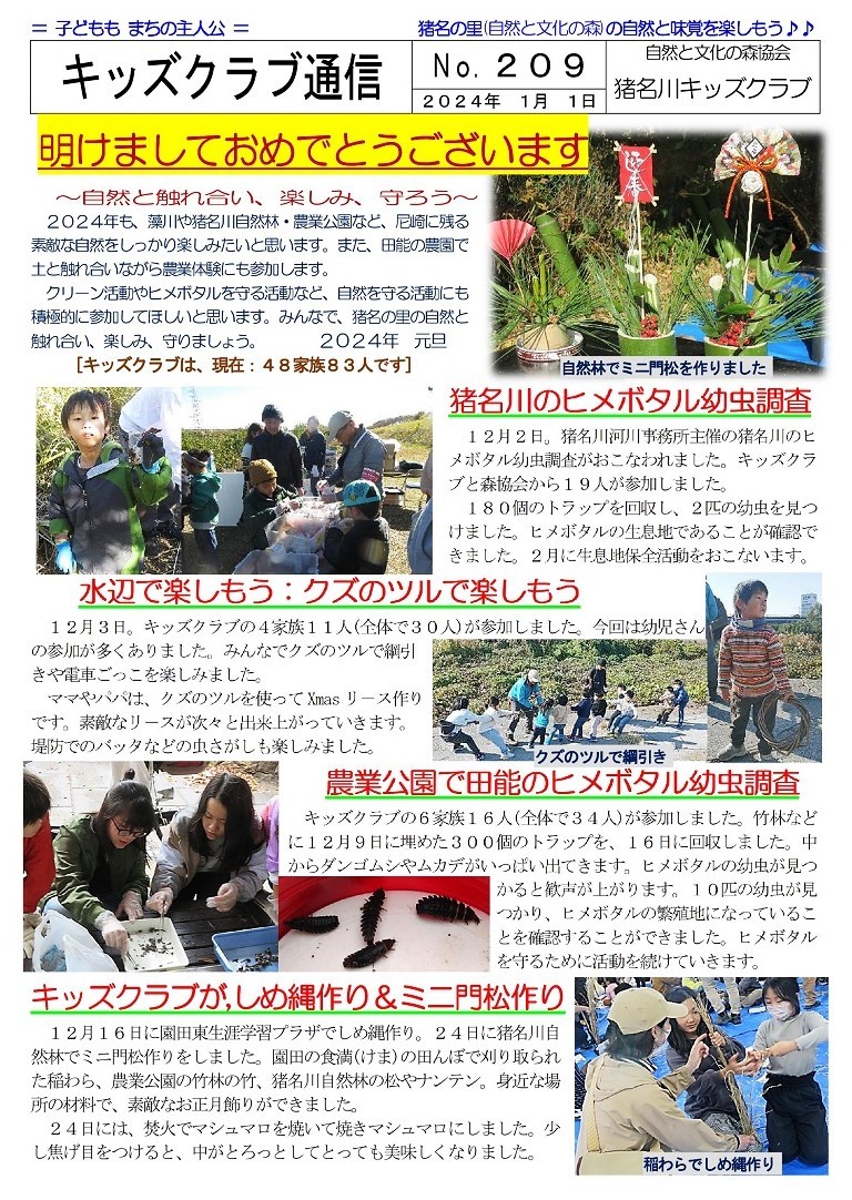 猪名川キッズクラブは2006年に発足し、「自然の中で楽しみたい! 自然を知りたい!」という子ども達が入会(登録)し活動に参加しています。1月末現在で48家族83人の子ども達(乳幼児〜高校生)が登録して活動に参加し、家族の触れ合いの場や親御さんの交流の場としても楽しんでいます。イベントによっては一般参加者の募集もおこなっていますが、猪名川キッズクラブ会員以外の方の参加は、事前の申し込みをお願いしています。