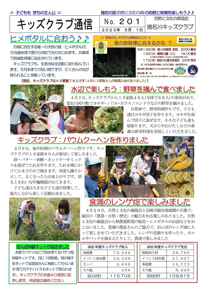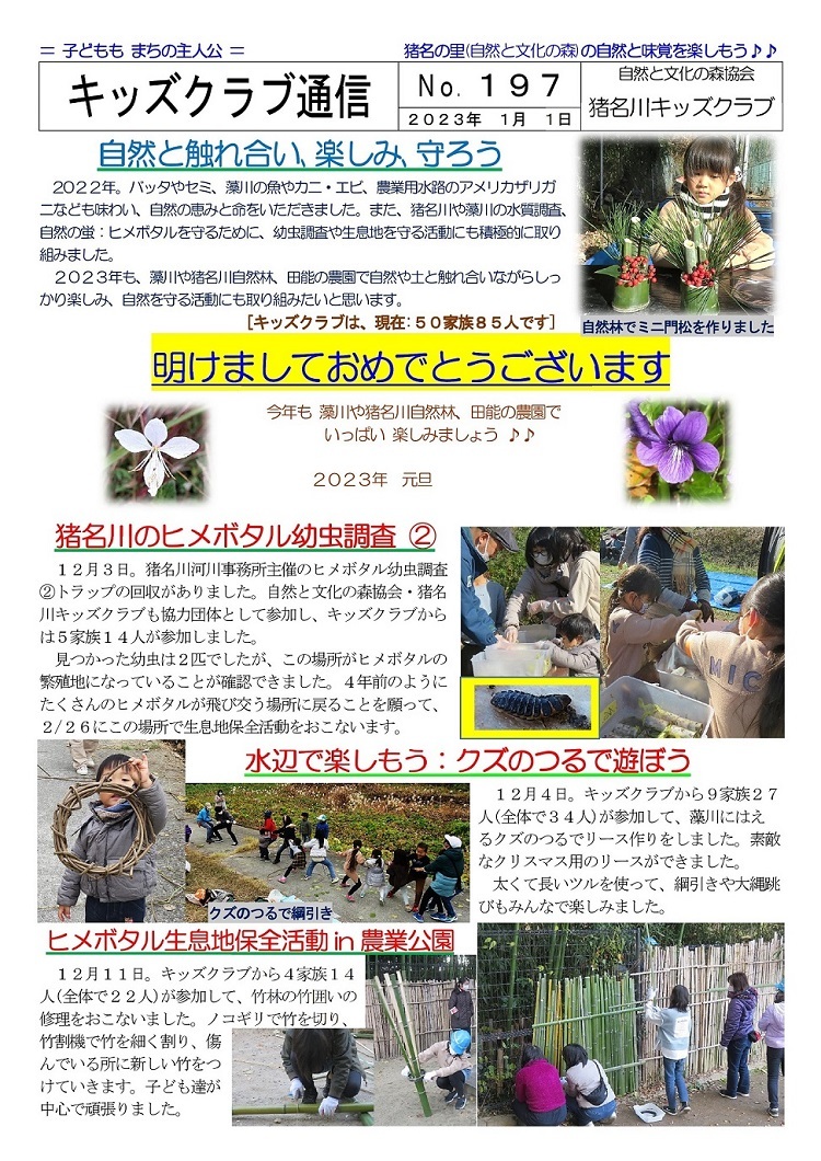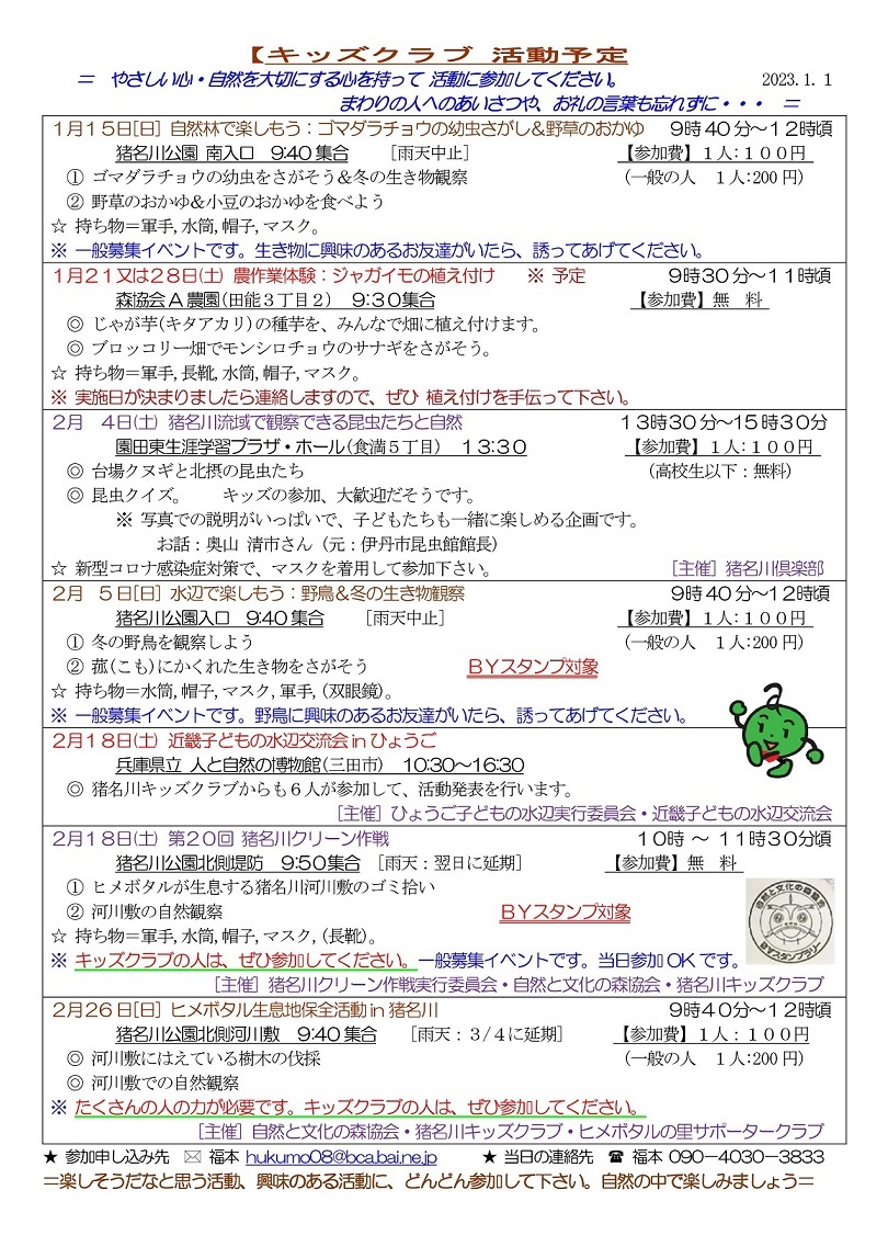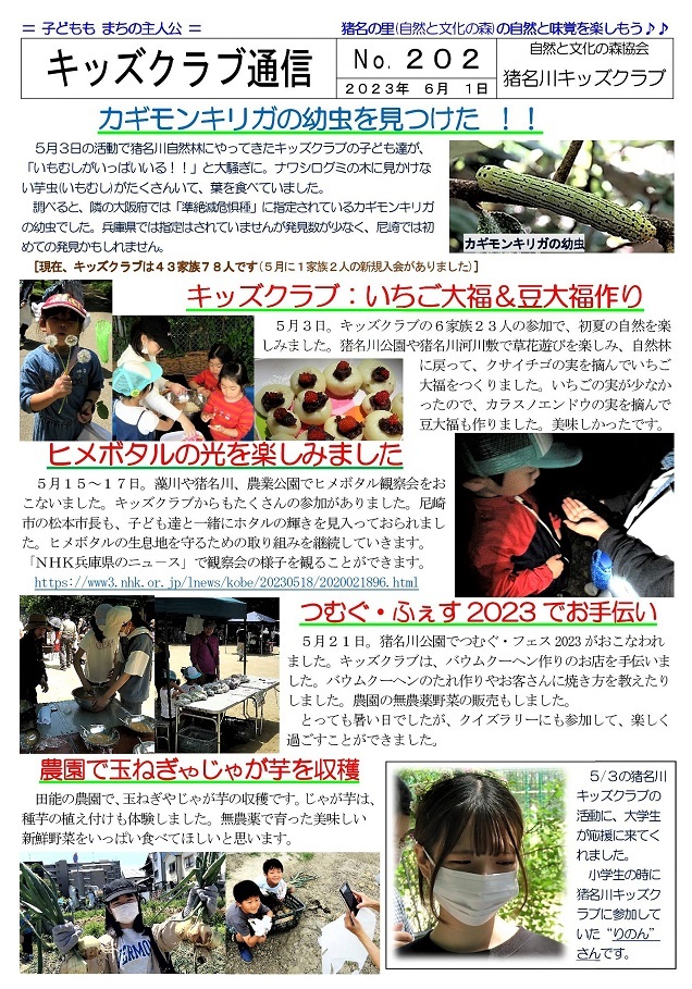 猪名川キッズクラブは2006年に発足し、「自然の中で楽しみたい! 自然を知りたい!」という子ども達が入会(登録)し活動に参加しています。5月末現在で43家族78人の子ども達(幼児〜高校生)が登録して活動に参加し、家族の触れ合いの場や親御さんの交流の場としても楽しんでいます。イベントによっては一般参加者の募集もおこなっていますが、猪名川キッズクラブ会員以外の方の参加は、事前の申し込みをお願いしています。