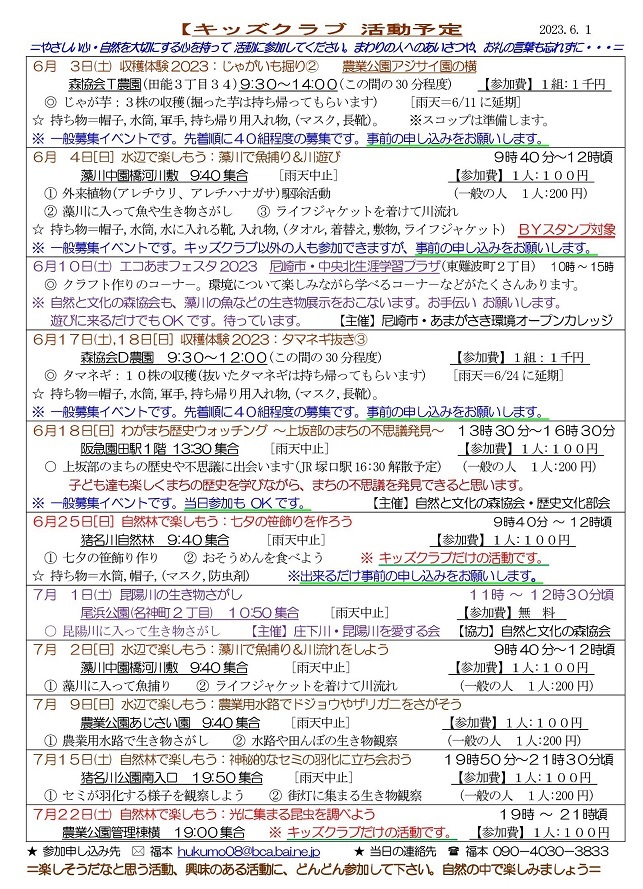猪名川キッズクラブは、傷害保険加入の関係で1年ごとの登録制です。幼児から高校生までが対象で尼崎市外居住の方もOKです。体験参加も歓迎します。高校生・大学生・元気な中高年などのボランティアスタッフも歓迎します。詳しくは、下記までご連絡ください。