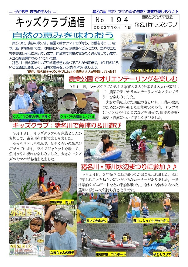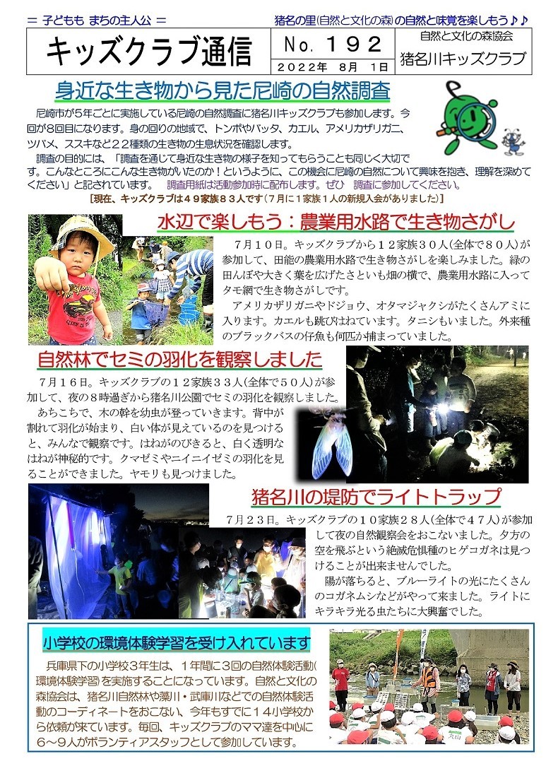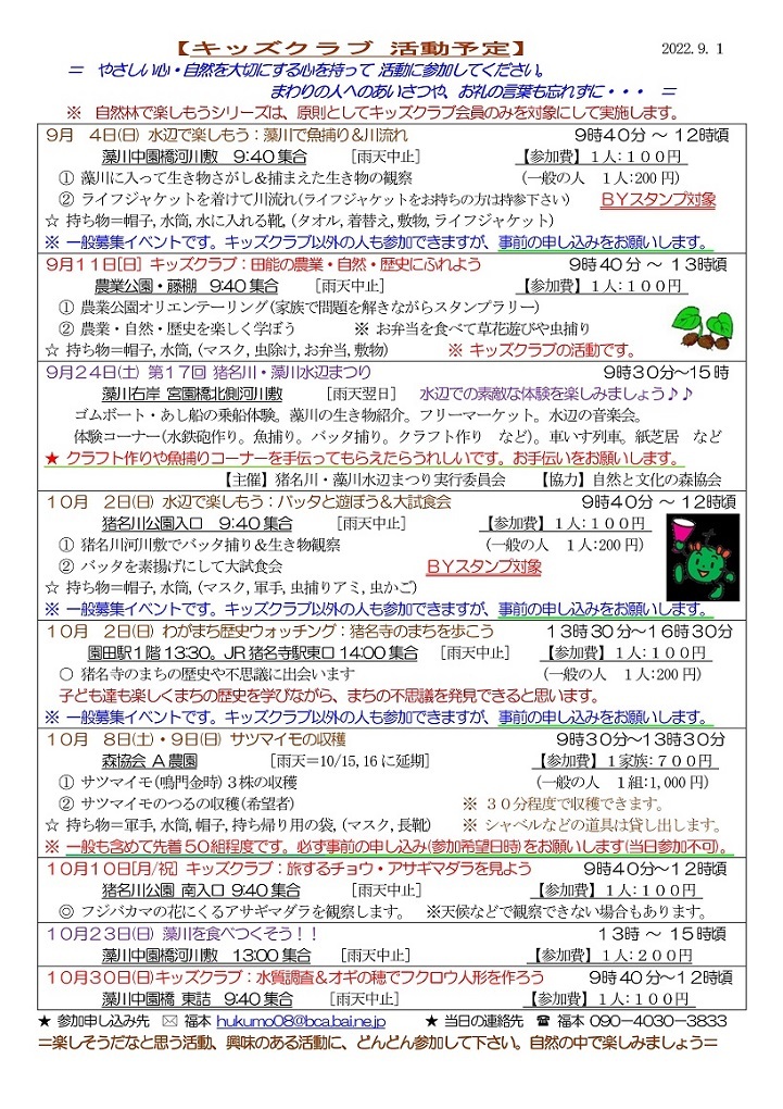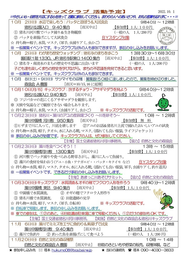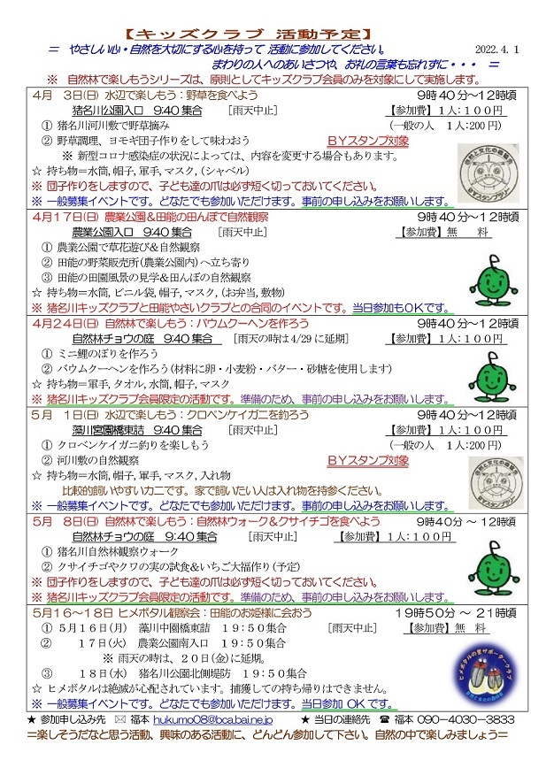 イベントによっては一般参加者の募集もおこなっていますが、新型コロナウィルス感染症対策のため、猪名川キッズクラブ会員以外の方の参加は、事前の申し込みをお願いしています。猪名川キッズクラブは2006年に発足し、「自然の中で楽しみたい! 自然を知りたい!」という子ども達が入会(登録)し活動に参加しています。10月末現在で、50家族85人の子ども達(幼児〜高校生)が登録して活動に参加しています。家族の触れ合いの場や親御さんの交流の場としても楽しんでもらっています。新型コロナ感染症対策もあり、2022年度の猪名川自然林での活動は一般募集をせずにキッズクラブ会員のみで行う予定にしています。
